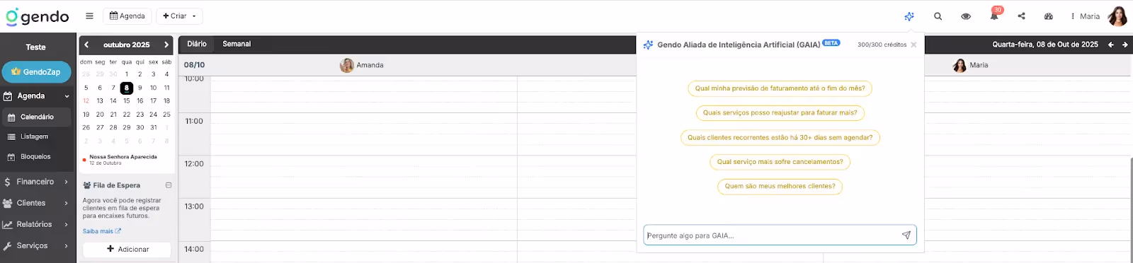 Apresentamos o chat inteligente GAIA, que analisa dados do seu negócio e fornece insights práticos para ajudar você a evoluir de forma mais precisa e informada.Como acessar: No topo do calendário, clique no ícone de estrela. Interaja com o chat e explore os insights disponíveis.